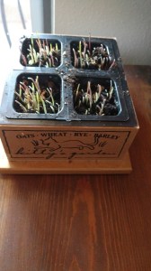 I bought a planter to grow “cat grass” because it was less expensive than purchasing the planted ones already growing in the pet store. My always-indoor beasties need grass every now and then to aid their digestion, but no access to it other than what I bring to them. To keep them from chomping on my house plants, I give them their own.